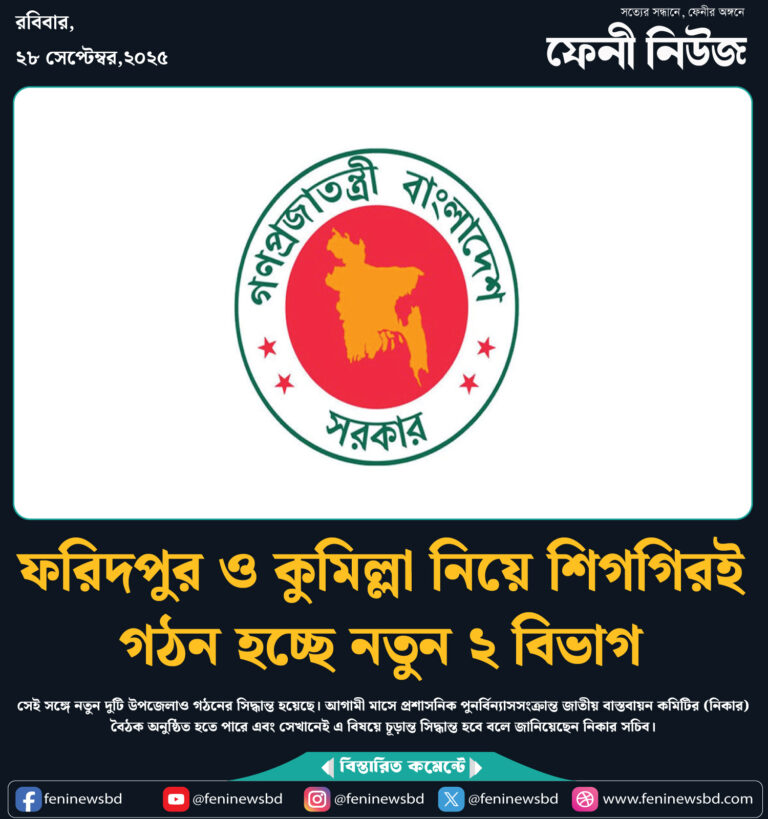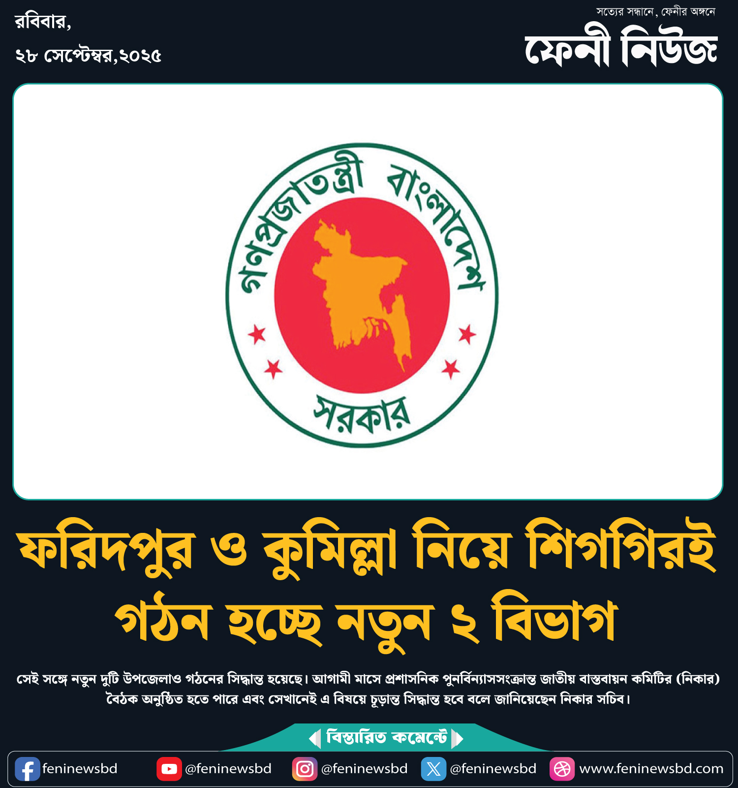 নতুন দুটি প্রশাসনিক বিভাগ প্রতিষ্ঠার কথা ভাবছে সরকার। সেগুলো হলো ফরিদপুর ও কুমিল্লা। সেই সঙ্গে নতুন দুটি উপজেলাও গঠনের সিদ্ধান্ত হয়েছে। আগামী মাসে প্রশাসনিক পুনর্বিন্যাসসংক্রান্ত জাতীয় বাস্তবায়ন কমিটির (নিকার) বৈঠক অনুষ্ঠিত হতে পারে এবং সেখানেই এ বিষয়ে চূড়ান্ত সিদ্ধান্ত হবে বলে জানিয়েছেন নিকার সচিব।