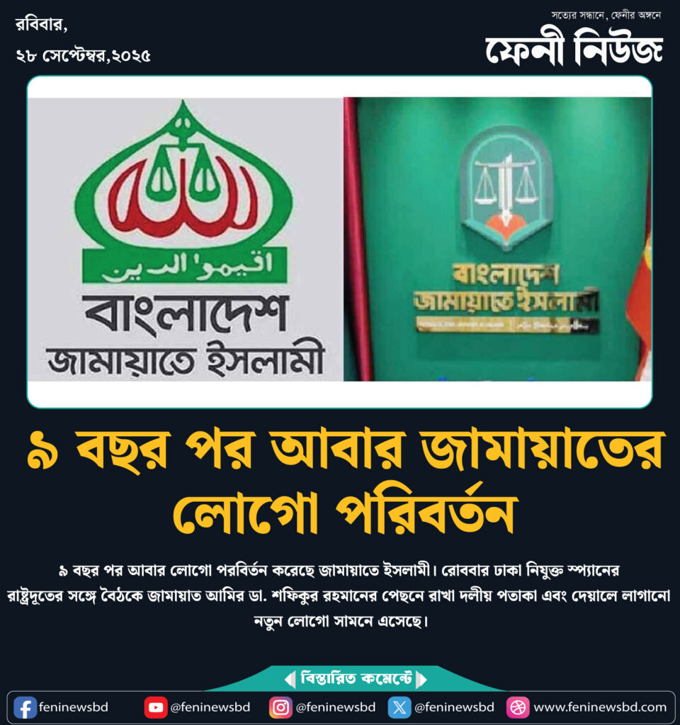 ৯ বছর পর আবার লোগো পরবির্তন করেছে জামায়াতে ইসলামী। রোববার ঢাকা নিযুক্ত স্প্যানের রাষ্ট্রদূতের সঙ্গে বৈঠকে জামায়াত আমির ডা. শফিকুর রহমানের পেছনে রাখা দলীয় পতাকা এবং দেয়ালে লাগানো নতুন লোগো সামনে এসেছে।