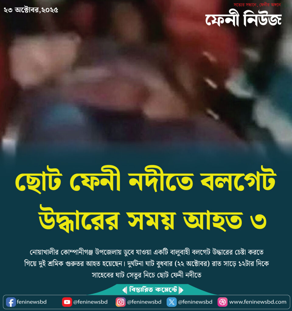 নোয়াখালীর কোম্পানীগঞ্জ উপজেলায় ডুবে যাওয়া একটি বালুবাহী বলগেট উদ্ধারের চেষ্টা করতে গিয়ে দুই শ্রমিক গুরুতর আহত হয়েছেন। দুর্ঘটনা ঘাট বুধবার (২২ অক্টোবর) রাত সাড়ে ১২টার দিকে সাহেবের ঘাট সেতুর নিচে ছোট ফেনী নদীতো